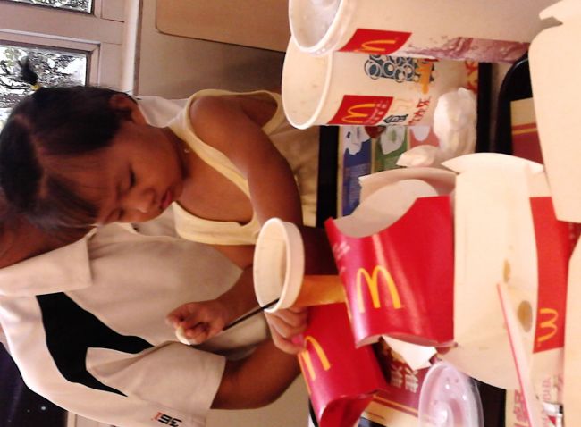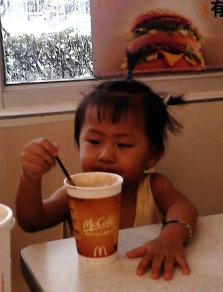 人家都用吸管吸,她用吸管挑着吃